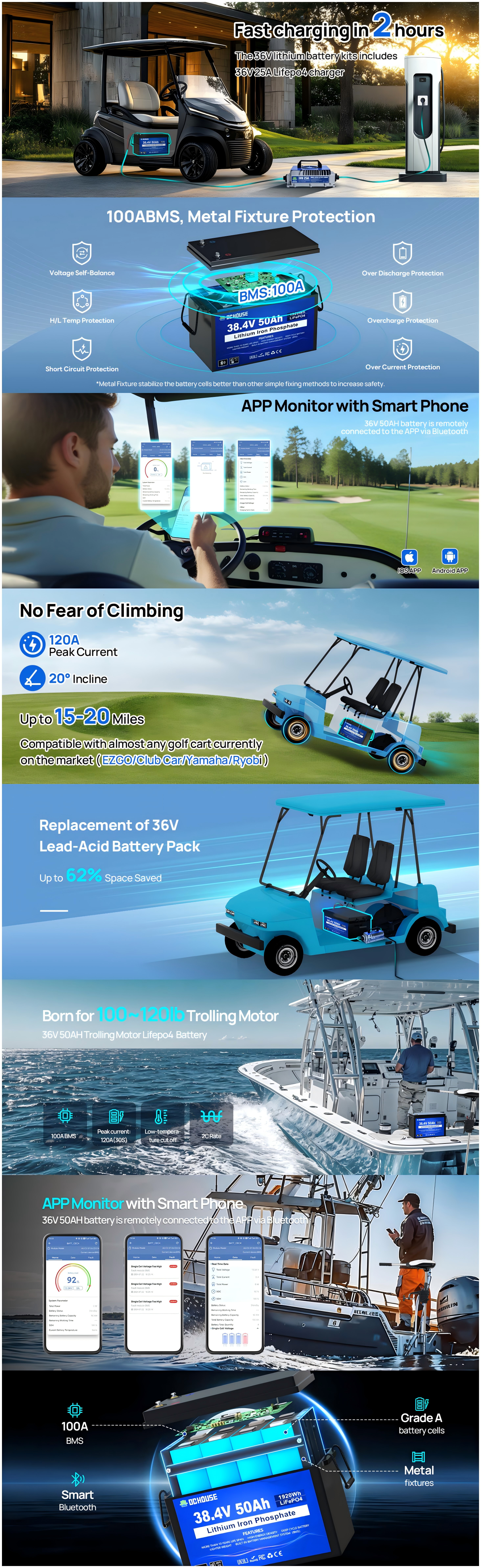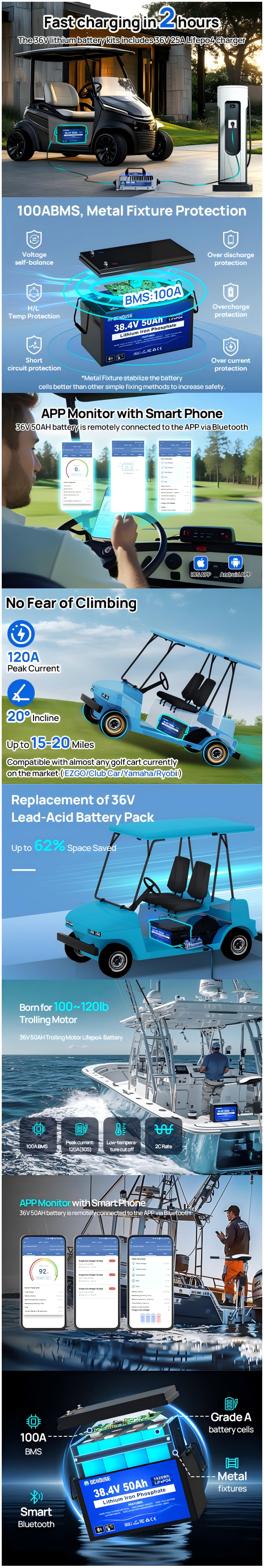 36V 50Ah LiFePO4 Lithium Bluetooth Golf Cart Battery